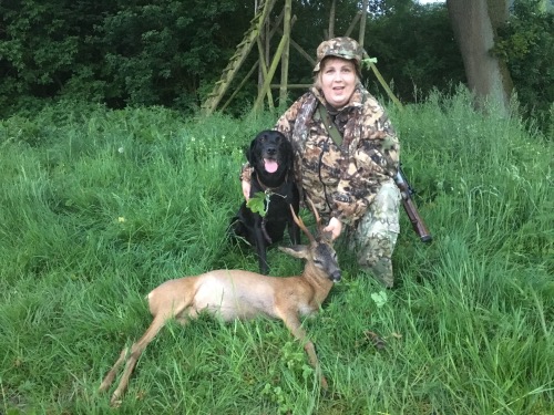 19.05.2017 Beim heutigen Ansitz kam Helga auf einen braven 6er zu Schuß. Mit Blattschuß sprang der Bock am Rande einer Schneise in den dichten Bestand. Ohne lange zu warten, da das Licht nicht mehr lange hielt, brachte Thorsten Corvin. Helga arbeitete ca. 25m auf dem Feld mit Corvin am Riemen, bevor es in den Bestand ging. Hier kamen beide zusammen nicht mehr weiter und Helga schickte Corvin zum Bringseln. Nach kurzer Zeit kam er mit Bringsel im Fang zurück und wir krabbelten auf allen Vieren hinter Corvin her. Nach 20m lag der Bock verendet in den Ästen. Wieder eine hervorragende Arbeit von Corvin und Helga.