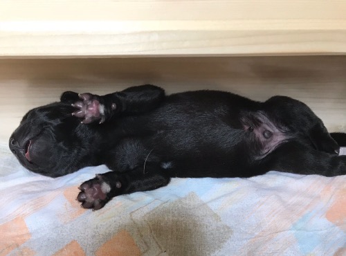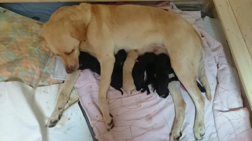 03.07.2018 Die Welpen sind da. Ein gelber Rüde, vier schwarze Rüden und zwei schwarze Hündinnen.