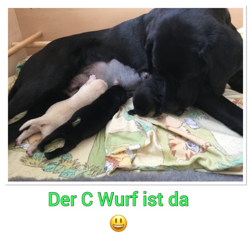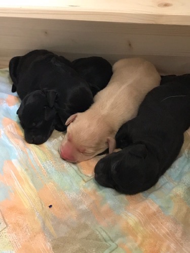 09.04.2018 Die Welpen sind da. Ein gelber Rüde, zwei schwarze Rüden und eine schwarze Hündin. Am 10.04.2018 ist leider der kleinste Rüde verstorben.