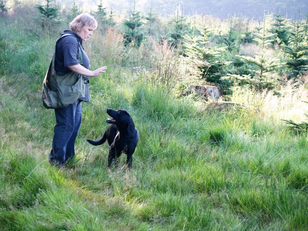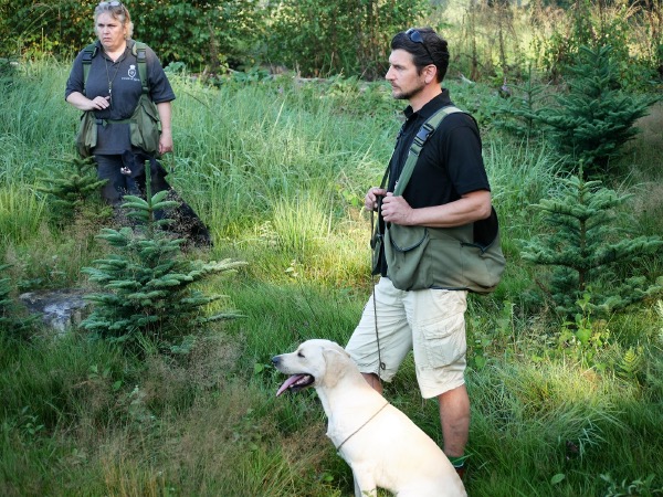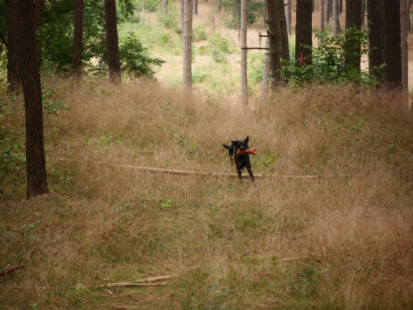 28.07.2016 Beim heutigen Ansitz erlegte Helga einen Bock. Mit gutem Schuß sprang das Stück ab und verschwand im Bestand. Mit Corvin ging es zur Nachsuche. Der Anschuß war schnell gefunden und Helga schickte Corvin zum Bringslen. Innerhalb kürzester Zeit brachte Corvin (beide auf allen Vieren) zum Bock im dicksten Unterholz. Wieder eine tolle Leistung.